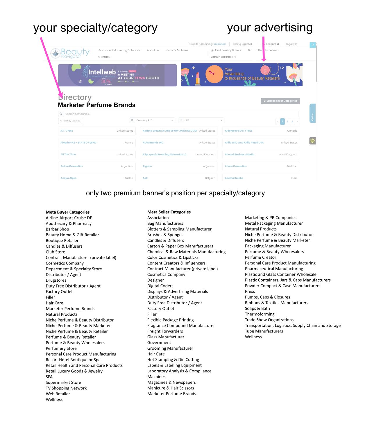 Beauty Navigator is used by an average of 500 visitors per day. To help companies maximize their visibility,we now offer advertising banners placed at the very top of each directory category page.